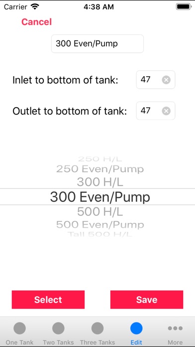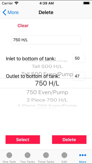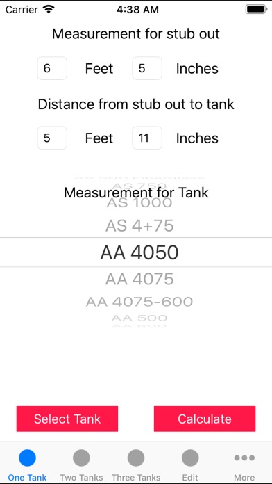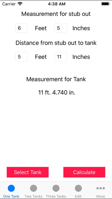 Start by entering the measurement at the stub out. Then enter the distance from the stub out to where the tank inlet will be. Touch Select Tank, then choose your tank from the Picker Wheel. Press Calculate to get your measurement for the depth to set your tank. There is a double picker wheel if you are installing two tanks of different sizes. There is a triple picker wheel if you have three tanks of different sizes to install. Septic is pre-populated with a list of common size tanks. You can edit the name of any tank, inlet height or outlet height from the Edit tab. You can add your own tanks, delete tanks that you don’t want or change the fall rate to the tank.