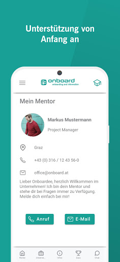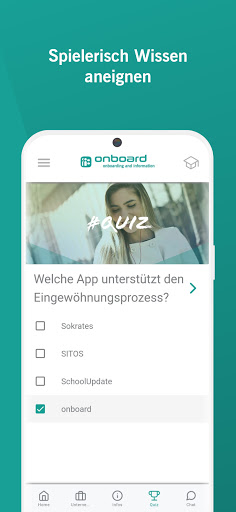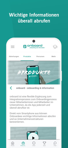 onboard ist eine flexible Ergänzung zum Integrationsprozess eines neuen Mitarbeiters ins Unternehmen, da sie jederzeit und überall abrufbar ist. Direkt vom Smartphone aus können Onboardees wichtige Informationen abrufen, spielerisch Unternehmensstrukturen, Werte und Umgangsformen sowie Produkte des Unternehmens kennenlernen und sich mit anderen Neuankömmlingen austauschen und vernetzen. Damit unterstützt die onboard-App nicht nur bei der anfangs schwerfälligen Orientierung am neuen Arbeitsplatz, sondern auch bei der sozialen Integration ins Unternehmen und schafft damit eine Plattform, wo alle anfänglichen Unsicherheiten gleich zu Beginn über Bord geworfen werden können.