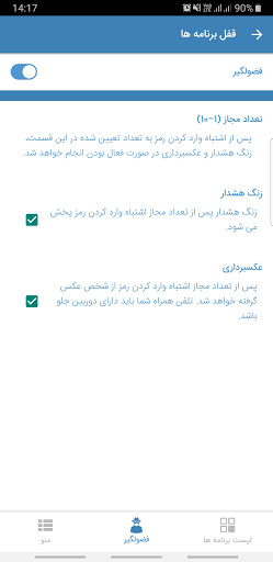 - قفل برنامه ها دارای یک فضولگیر قدرتمند بوده که از اشخاصی که تلاش برای بازکردن قفل برنامه های شما می کنند عکس گرفته و در اختیار شما قرار دهد.