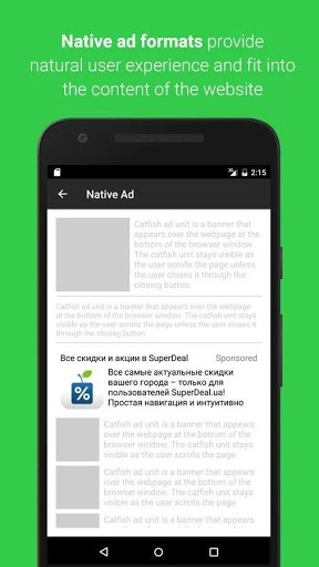 Native ads, rich media, expandable ads and other monetization formats are available for publishers, including the unique formats you won’t find on other platforms: in-text that allows to monetize your websites or applications through links in texts set on words or phrases relevant to the mobile offer hiding under the link, and gift ad format made in a form of an element that offers a user to approach the ad in an interactive way.