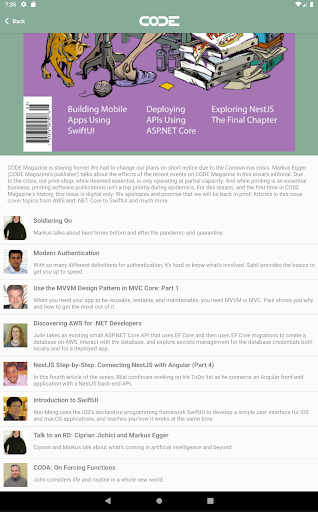 This app allows CODE Magazine subscribers to read all the issues of the magazine they own on their Android device.