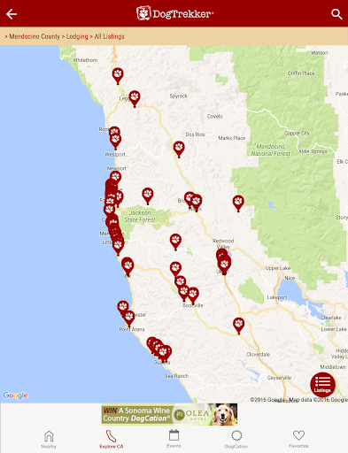 This free mobile app provides ‘Nearby’ lodging, dining, hikes, splash zones, attractions and local services, including emergency services, wherever you are in California. Switch over to the ‘Explore’ mode and you will be able to plan your trips throughout California’s 15 regions, 58 counties and hundreds of cities. Within these destinations, you’ll not only find listings, but over 1,000 associated stories pulled from the DogTrekker.com editorial library.