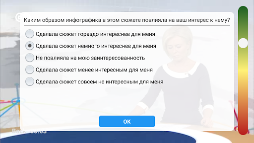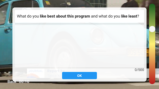 VideoMetrics is a research app for real-time assessment of TV programs and online videos. Participants watch a TV program or video on their Android device and give spontaneous feedback using the on-screen slider. From time to time during the program a simple multiple-choice question can be asked – collecting reactions to that specific scene.