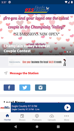 Fresh Country for The Champlain Valley. Tune in your radio to 97.5FM or listen online at www.eaglecountry975.com for news, weather, sports, family fun, contests and more! Eagle Country 97.5 plays more of your favorite country music. Eagle Country 97.5 is independently owned and focuses on local businesses and local community events.