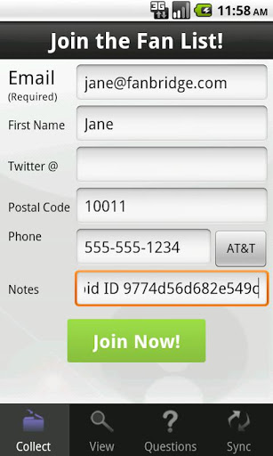 Throw out that clipboard and get fans excited about joining your mailing list at shows/events! Once you download the FanBridge Fan Collector app, you can instantly start collecting detailed fan info from ANY Android phone or tablet, Version 2.0.0 includes fixes for all previous known issues and adds new functionality, including answering Fan Questions!