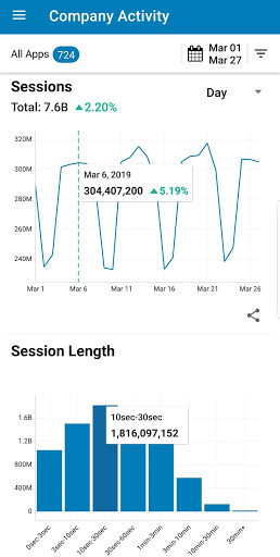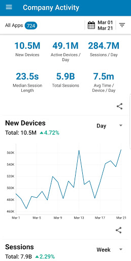 Summary Metrics: Track active users, new users, sessions, time spent for all your apps.