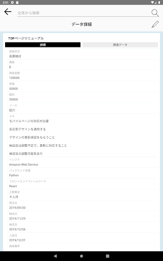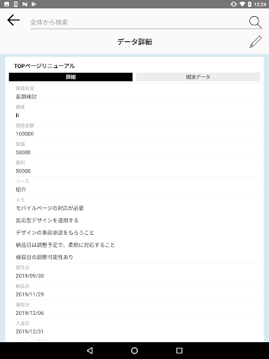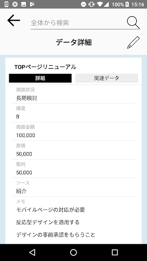 進行中の商談データにアクセスして参照することができます。商談金額や受注日に変更があった時に、出先からスマートフォンで最新情報に更新することができます。