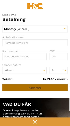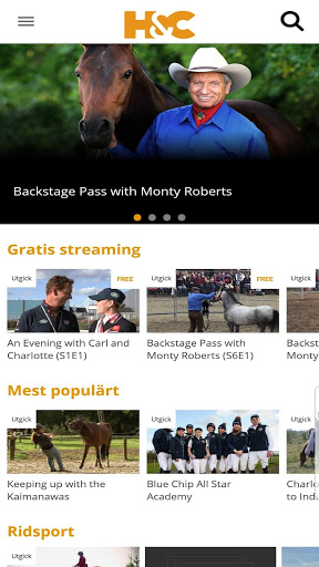 "I vår app kan du titta på horse & country på din smartphone, surfplatta eller i flera andra enheter. Du kan redan nu se några av våra utvalda gratisprogram. Eller gå med nu för att låsa upp hela vårt premiumbibliotek. Prenumeranter kan även titta på live-kanalen, få 10-dagars ”catch up”, ett helt arkiv On Demand plus rekommenderat innehåll baserat på serier, hästprogram och dokumentärer som du gillar. Du får tillgång till en omfattande programkatalog och mycket mer.
