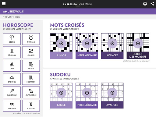 - Trois grilles de mots croisés et de sudokus ainsi que l’horoscope tous les jours;