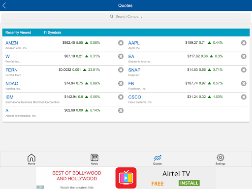 • Select the Quote icon to see a list of stocks that you viewed, with the latest price information.