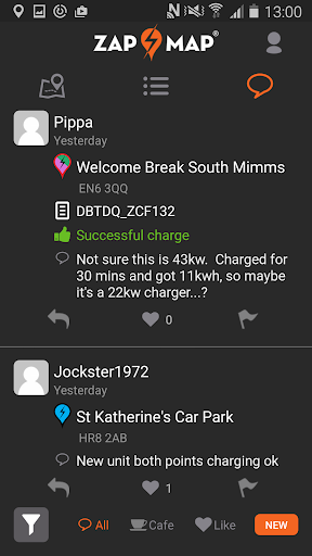 - Community feature “Zap-Chat” allows you to add successful charge, update charge point status, report ICEd, add photos/comments and "last mile" info for the benefit of the EV community. Zap-Chat now also has a "cafe" area where you can ask questions or chat with other Zap-Map users.