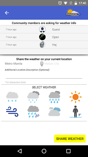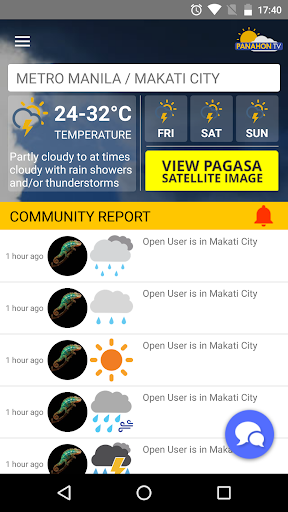 The Panahon Mobile Application is equipped with a ticker where you can view reports from our helpful community. You can also take part of the community by sharing the weather status from your location! The app has a GPS capability that enables it to know your exact location and filter the community reports with the most relevant ones!
