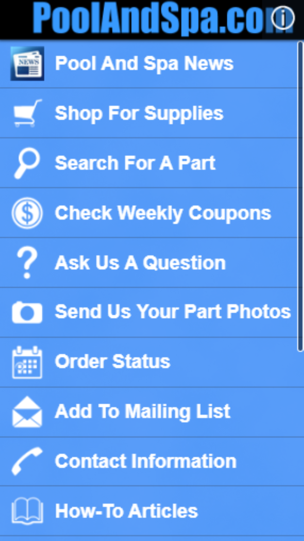 The PoolAndSpa.com Mobile App lets users access both our standard PoolAndSpa.com web site, as well as our Mobile optimized site, m.PoolAndSpa.com. We are the world's oldest & largest web site for Swimming Pool & Hot Tub Spa owners and buyers with over 5000 pages of Information, Parts And Supplies. In our App, you can shop and order via your Mobile Device, as well as get direct access to your Order Status. We also have links to all our popular Social Sites including Facebook, Pinterest, Twitter YouTube and Google+. You can also use our powerful Parts Search Feature to easily locate the Parts or Supplies you may need for your Pool or Hot Tub right from your Mobile Phone. We also include hundreds of How-To Articles and How-To Videos to help you in repairing and maintaining your own Pool or Hot Tub.