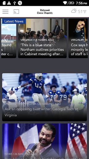 The Richmond Times-Dispatch is Richmond and Central Virginia's leading source for local news; Virginia politics; high school and college sports; commentary; entertainment; arts and events. Download our free smartphone and tablet app for breaking news, today's headlines, local job listings, weather forecasts and traffic updates on the go. If you have news and photos to share, simply click Submit a Story and upload your report.