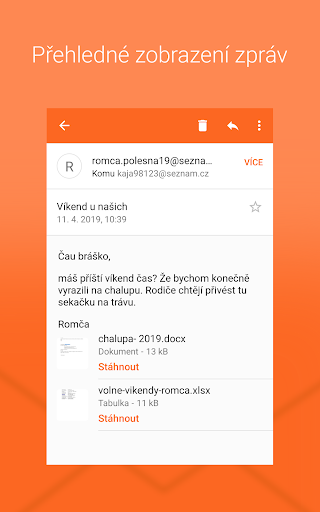 S aplikací Email.cz od Seznamu máte svou e-mailovou schránku všude s sebou. Upozorní vás na nový e-mail. Snadno najdete i starší zprávy. Přílohy otevřete přímo v aplikaci. A pokud máte schránek víc, můžete si je přidat a jednoduše mezi nimi přepínat. Všechny navíc můžete ochránit PIN kódem, takže se k nim nikdo jiný nedostane.