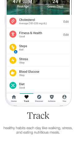• Turn health trackers from red to green to earn “green days” and lower your RealAge