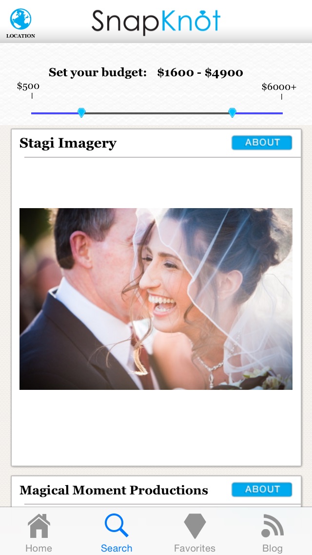 SnapKnot allows engaged couples to search for wedding photographers by location, budget, and visual style. Compare and contrast photographers who fit your custom search criteria.