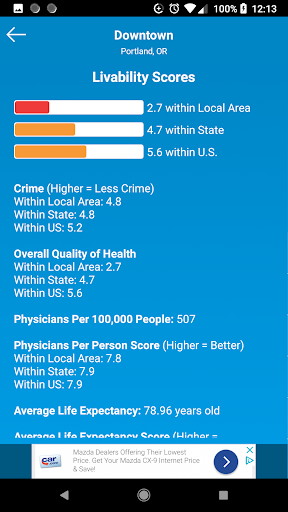 The BestPlaces mobile app gives you comprehensive place ratings for all 217,000 block groups across the United States– pinpoint information down to the detail of a few city blocks. Using mobile device geolocation for a level of accuracy and insight that is not available via desktop computer or laptop, this is the most detailed U.S. place info available.