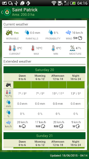 You will receive information about current weather and extended up to 5 days with: chances of precipitation, MM rainfall, minimum maximum temperature. relative humidity, wind direction and speed.
