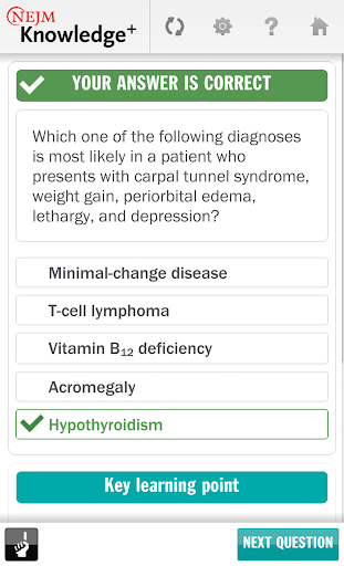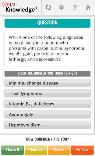 NEJM Knowledge+ is the only lifelong learning and board review product that uses state-of-the-art adaptive learning technology to continuously assess the subjects you know and identify the areas where you need reinforcement. It then delivers questions based on what you know already, what you need to study more, what you are struggling to master, what you think you know better than you do, and what you might be forgetting.