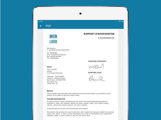 Simple et rapide, TECH REPORT permet d’éditer très simplement des rapports d’interventions de qualité professionnelle au format PDF pouvant intégrer des médias photos et être validé par le client, directement sur le smartphone ou la tablette, grâce à la signature électronique.