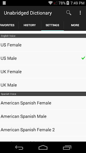 • Natural-sounding voices for entries, definitions and examples in both languages (British and American English, European and American Spanish)