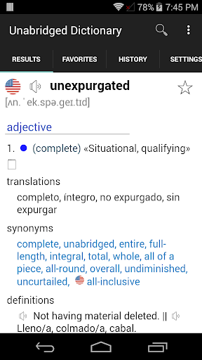 WORKS OFFLINE. By far, the largest English to Spanish and Spanish to English Dictionary at any price! It includes all our specialized terminology (Legal, Medical, etc.) and natural-sounding voices in a variety of bilingual accents. Featuring a detailed Verb Conjugator, translations with definitions, examples, and quotes; results are easy to review while you navigate in-depth information for each entry.