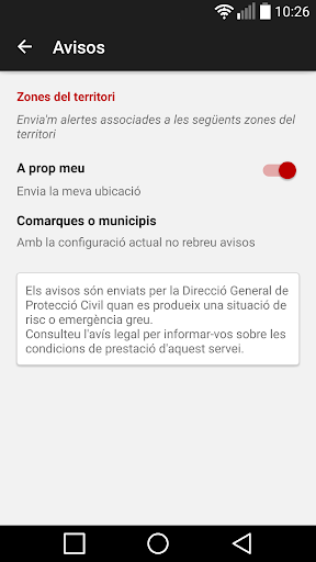També envia notificacions d’emergència de Protecció Civil de la Generalitat. El servei informa sobre què està succeint, quan, on i què fer, en situacions d’emergència, sigui per geolocalització de l’usuari o per subscripció a zones d’interès.