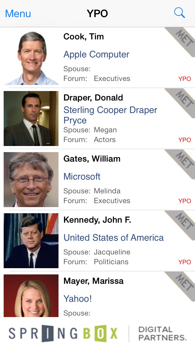 This app was designed specifically for chapters of the Young Presidents Organization. YPO CONNECT RM gives YPO chapter members a mobile member directory and list of events for their Ed year. It lets users track who they've met within their chapter, see which chapter members are near them, and RSVP and pay for chapter events directly through the app.