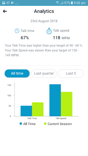 • Receive important metrics on your talk time and talk speed in simple, clear charts