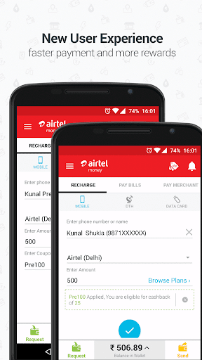 The new Airtel Money app provides you the best in class payment experience that is easy, instant and rewarding. In just a few steps you can Recharge (Prepaid and DTH), Pay Bills (Postpaid Bills, Utility Bills, Bills for Merchants and Shops in your vicinity), as well as Transfer Money to Friends and people, and even other Bank Accounts. It also allows you to shop online and offers you the best deals!