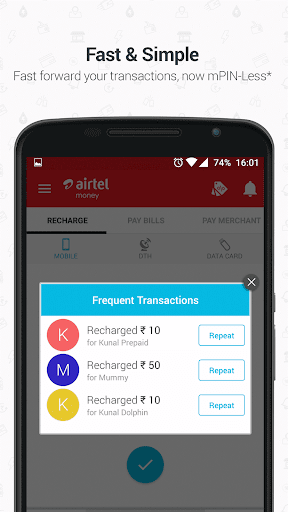 The new Airtel Money app, which works for all telecom carriers in India, also allows you to carry out transactions without your mPIN, so you can perform frequent transactions with just one touch! You can discover merchants near you, which makes location based payments faster and easier. You can even get various offers at shops and restaurants in your locality, so your regular shopping and dining experience is more rewarding than ever! With this new app, requesting money from your contacts was never easier. Now you can even tap & request money on and from NFC enabled devices.
