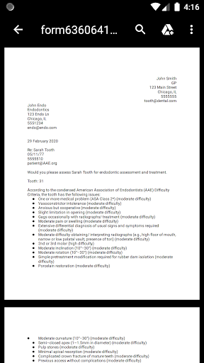 If the user finds the case beyond their ability, they may choose to refer the case. An automatic referral letter can be generated and printed with the details of the referral. The user can choose to take photos with their phone. This is useful if photos of radiographs or clinical appearances are desired.