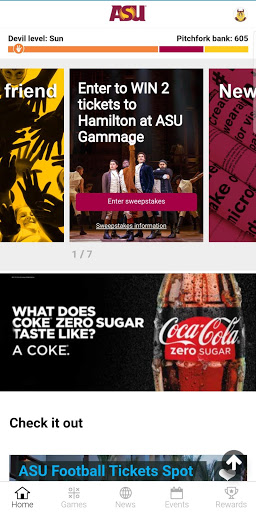 You can redeem your ASU Sun Devil Rewards Pitchforks for chances to win incredible Sun Devil Rewards, like Arizona State University gear, VIP tickets to the big game, backstage passes to ASU Gammage performances and other ASU essentials, all straight from the app.