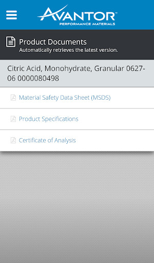 The AskAvantor Mobile App for Document Retrieval allows users instant access to important product information, right from their smartphone or mobile device. Users can enter product identification numbers manually - or automatically scan barcodes on Avantor product labels - and save, view, email or print key information like Material and Safety Data Sheets (MSDS), Product Specifications and Certificates of Analysis related to that chemical product.