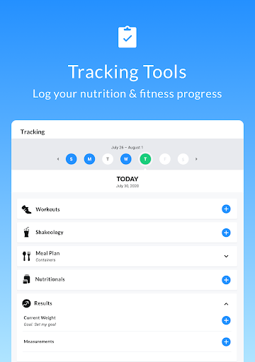 • Log your daily workouts, nutrition, Shakeology®, water intake as well as weight and measurements with built-in tracking tools