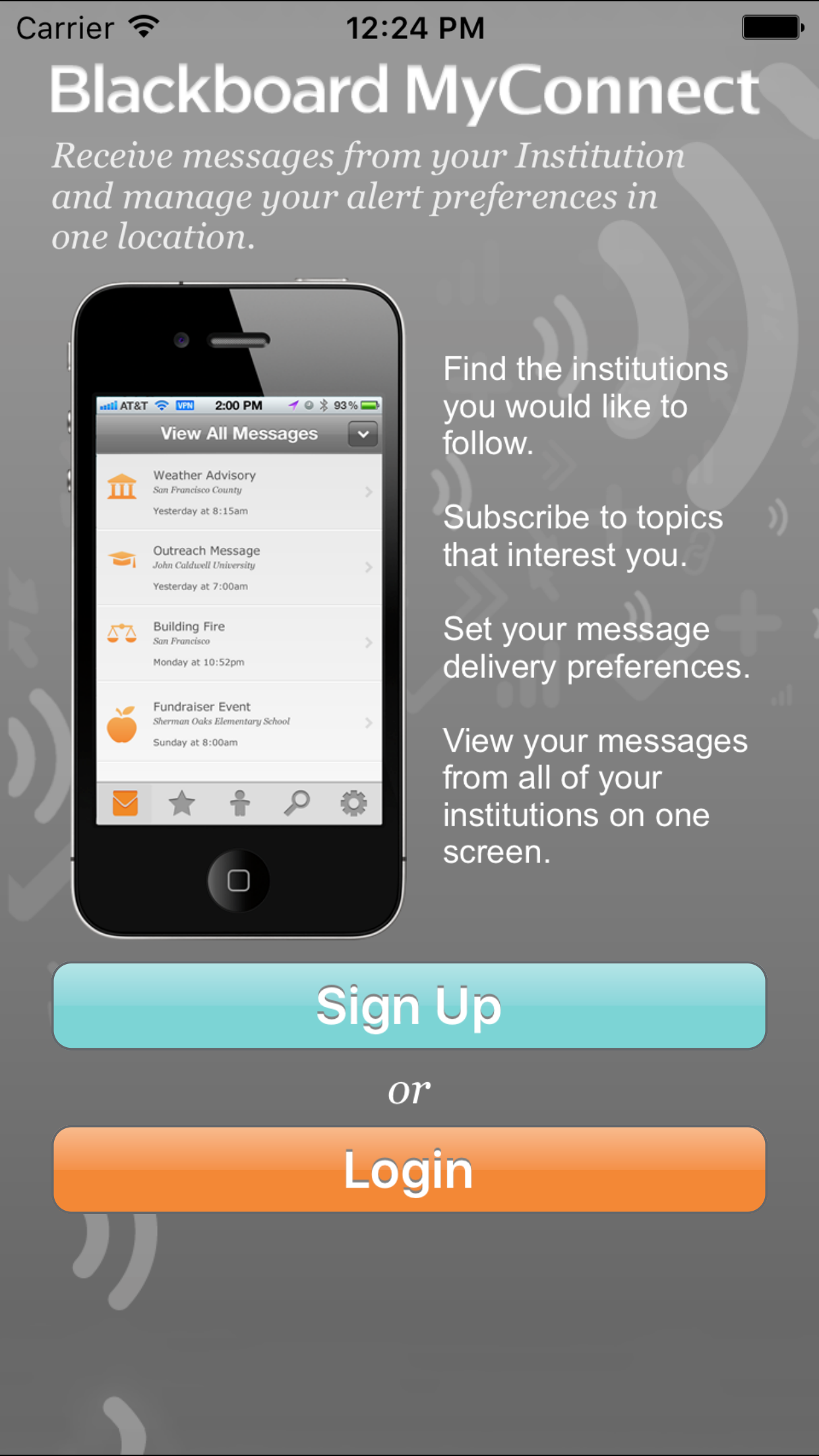 Thanks to mobility, you can stay connected no matter where you go. Now with the Blackboard MyConnect™ smartphone app, you can stay in touch with the institutions that matter to you, too. If you have a relationship with an organization that sends alerts from Blackboard Connect – whether a school, university, local government or a private business, you can use MyConnect to personalize your message experience and stay in touch no matter where you are.