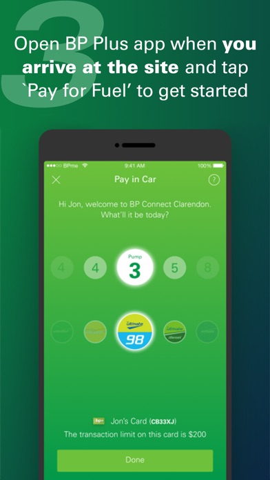 Simply pull up to a mobile payment enabled store, open the BP Plus app, link your BP Plus fuel card and create your passcode. Once you're ready to purchase fuel, tap ‘Pay for Fuel’. Select your pump, fuel type and enter your passcode. You may need to enter your vehicle's odometer reading along with any prompts that are listed on your fuel card.