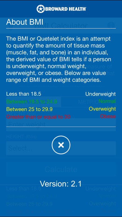 This Broward Health application will calculate your Body Mass Index (BMI) using your height and weight. It's very simply enter your weight and height in metrics or standard US units and the application will give you your BMI in seconds...