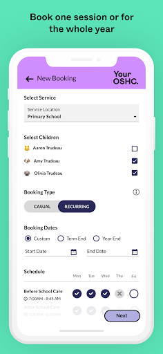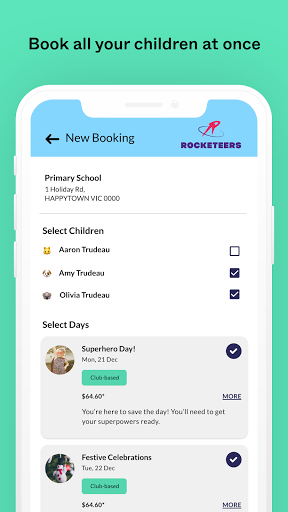 • Multi-booking feature (book all your children at once) • Schedule booking option (book one term or the whole year with the click of a button) • Booking calendar overview • Quick Balance – view your account balance with one-touch • Quick payment management – update payment details, pay full or partial bills, complete access to payment methods • Update your child’s details (including school, medical requirements, immunisation, physical or behavioural needs, priority of access and more)