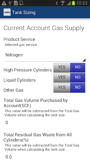 This app is to provide assistance in the proper sizing of a gas account during a mode change to cryogenic storage equipment by asking important inputs unique to the account and the gas supplier. The app is designed to work for nitrogen, oxygen, argon and carbon dioxide service with one gas per sizing.