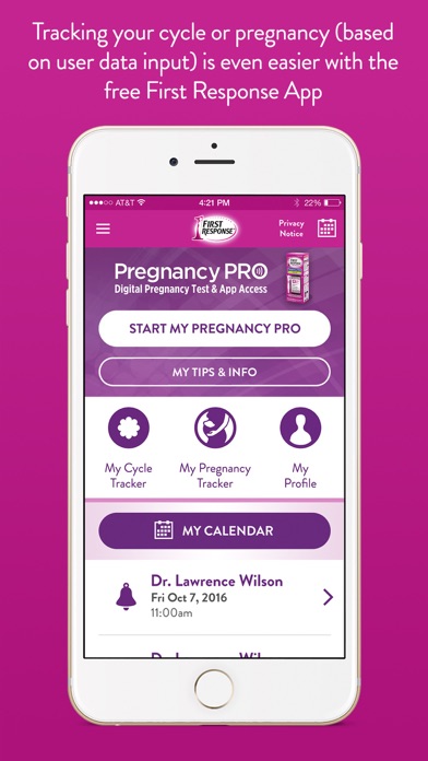 Tracking your cycle or pregnancy (based on user data input) is even easier with the free First Response App. Our updated app gives you access to exclusive pre- and post-pregnancy content, updated features and more when you purchase the First Response Pregnancy PRO Digital Pregnancy Test.