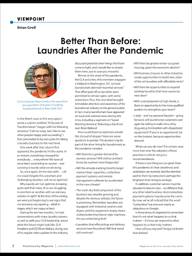 The coin laundry industry's leading publication is filled with in-depth articles, expert advice, laundry profiles and the largest, most comprehensive classified advertising section. The magazine is a resource for laundromat owners looking to grow or expand their business, as well for as potential investors researching the coin-op industry. The magazine is published by the Coin Laundry Association.