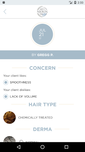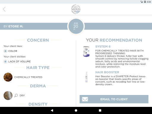 Hair Customization: Our App offers a client consultation tool that selects the recommended Nioxin products to transform thinning hair into thicker fuller hair. Your clients will receive the product recommendation via email while sitting comfortably in your salon chair. Take advantage of the DERMA and DENSITY hair scanner in order to keep track of your client's hair progress.