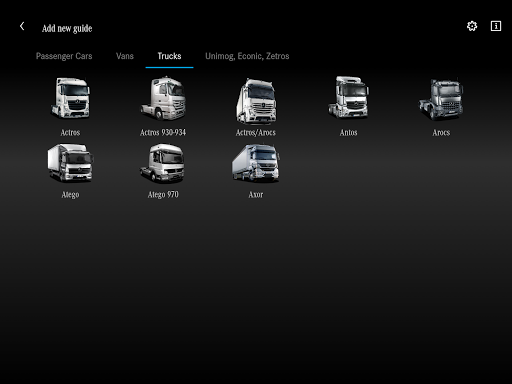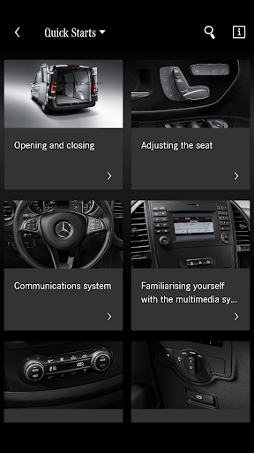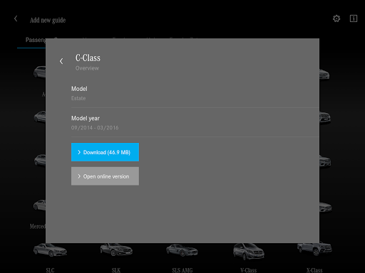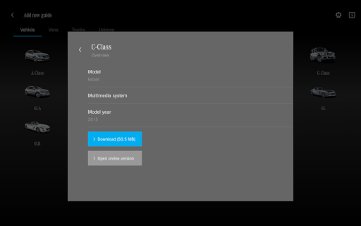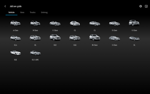 The "Mercedes-Benz Guides" App provides information on operating the vehicle. After the App has been started, the User can access all available models in the "My Guides" section.