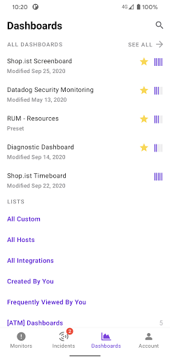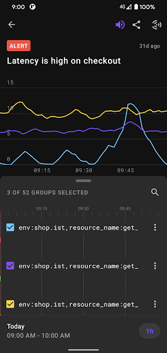 Check the status of your key performance metrics, SLOs, cloud integrations, and more with mobile access to your Datadog dashboards