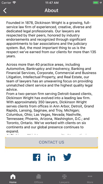 Dickinson Wright takes the next step in providing comprehensive customer service for our clients with the Dickinson Wright App for iOS. This free, user-friendly app will give you – at the click of the button – information on our firm, practice areas, attorneys and offices. Reach out directly to our attorneys and stay up-to-date on all the latest news and information about our firm and the legal community.