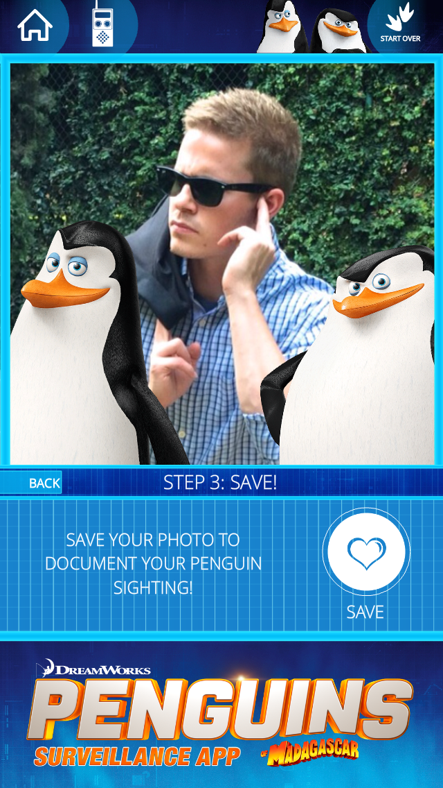 Smile and wave, boys! You've been entrusted with a super-secret spy app. Use your spy camera to catch the Penguins in action. Report your surveillance for a chance to win awesome prizes! You also have security clearance to eavesdrop on the Penguins super-secret missions.
