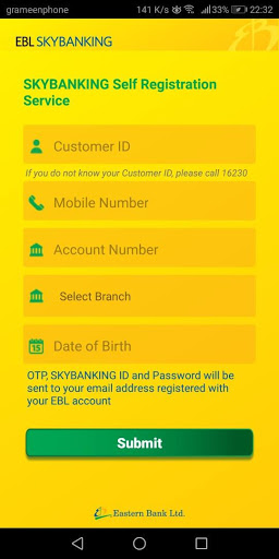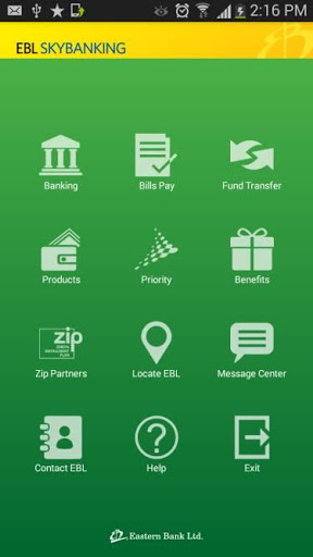 EBL SKYBANKING App can be used by anyone with a smartphone for locating EBL365s, branches, product and service information. The services include - Viewing Account and Card Information, Biometric Login, Fund Transfer, Bill Payment by both Accounts and Cards, Mobile Phone top-up by Accounts or Cards, EBL ZIP and Benefit Partner Information, Positive Pay Instruction, Meet & Greet and Other Service Requests, Locate EBL Branches & ATMs, Making Appointments and many more. You can use your EBL Debit/Credit/Prepaid Card or EBL Account information to register for the service- anywhere, anytime. You do not need to visit the branch to enroll for the service.