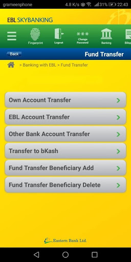 EBL SKYBANKING ensures the highest level of security for registration by verifying the mobile number and PIN of your card or verifying your account details via Contact Center. With the enabling of Biometric login EBL SKYBANKING is more secured than ever, using the fingerprint of your device for app access. A unique ID & Password is created for this app. 2 Factor Authentication System or 2FA is initiated by customers via email or SMS, allowing secured fund transfers.